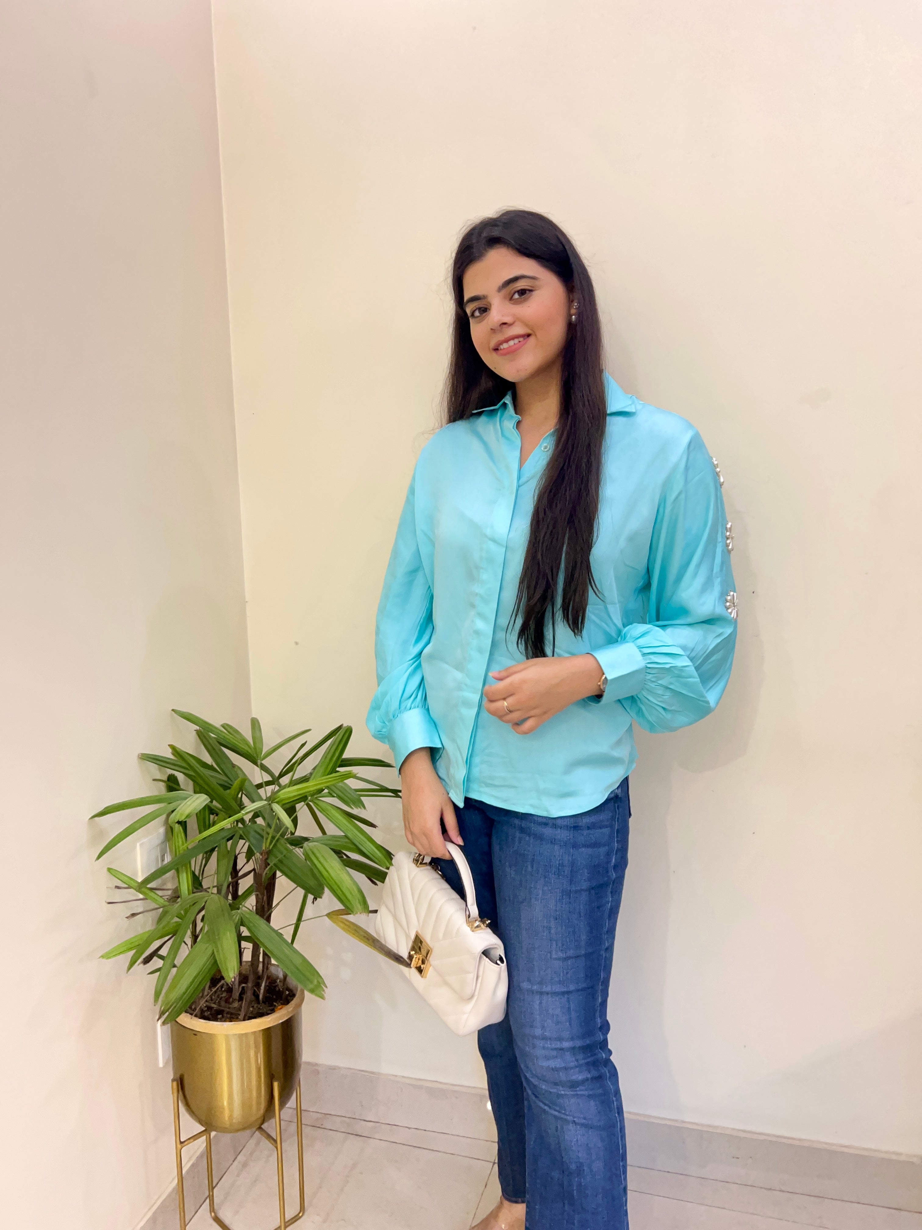 About Product - The Blue Modal Shirt With Flower Detailing will effortlessly complement a wide range of your casual outings. Available in XS to XL sizes. The perfect outfit you can ever find on the Internet.