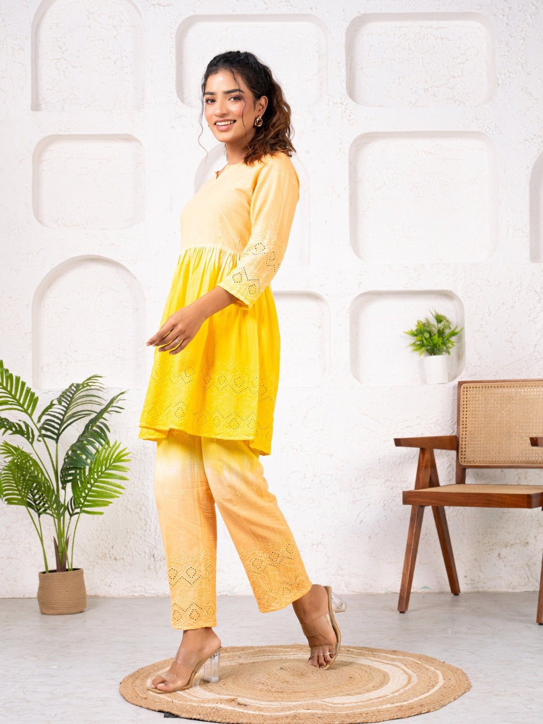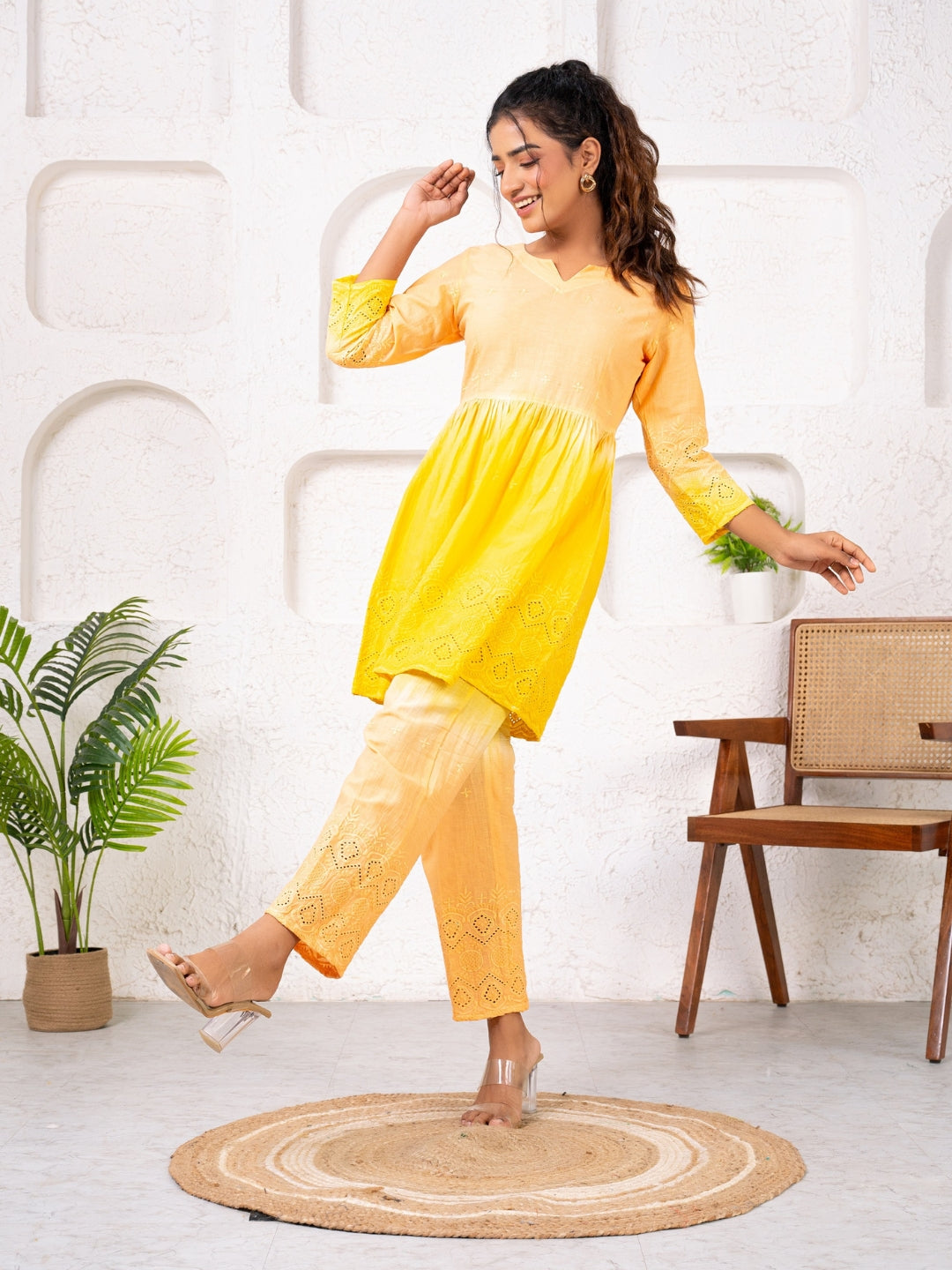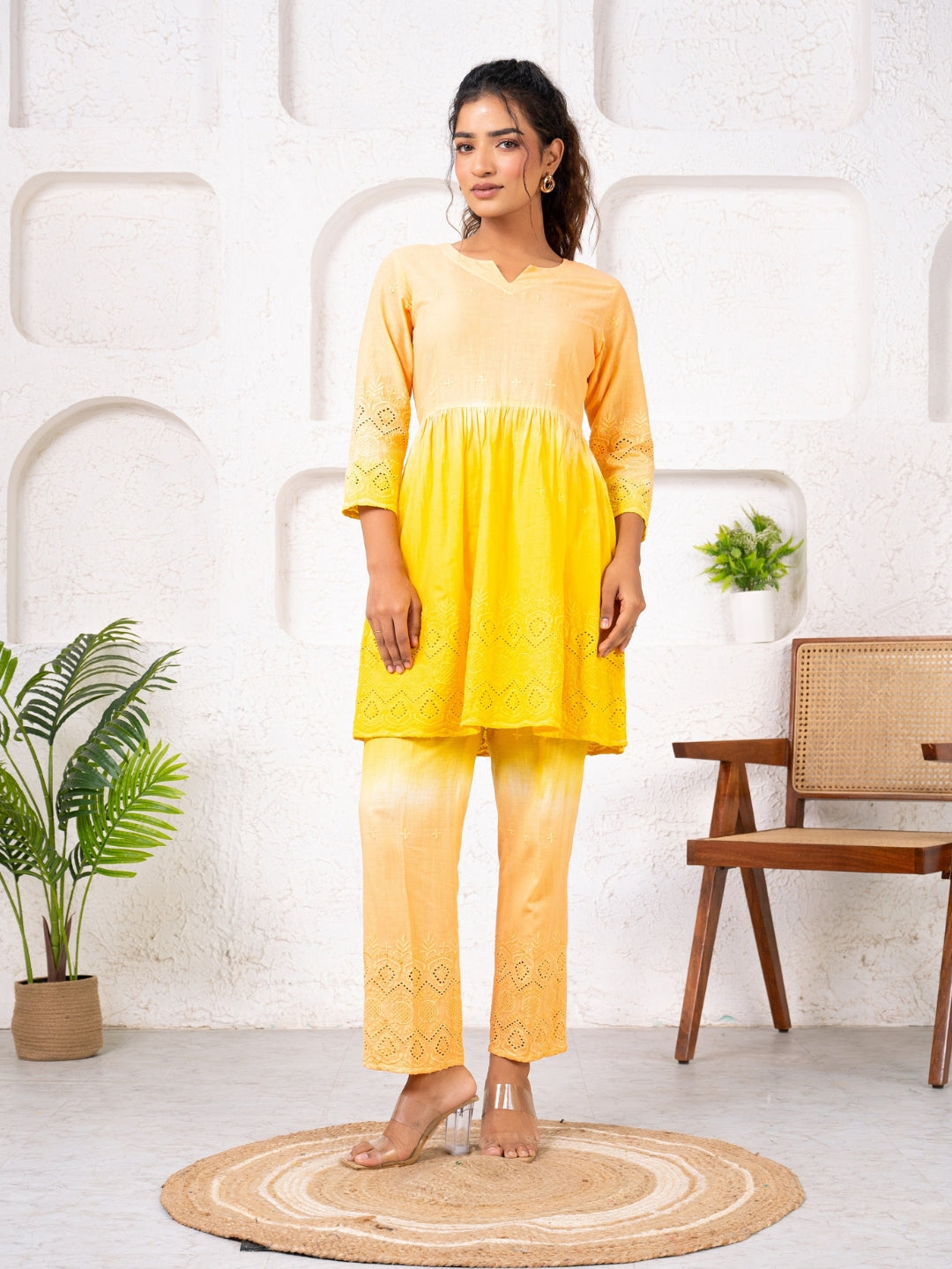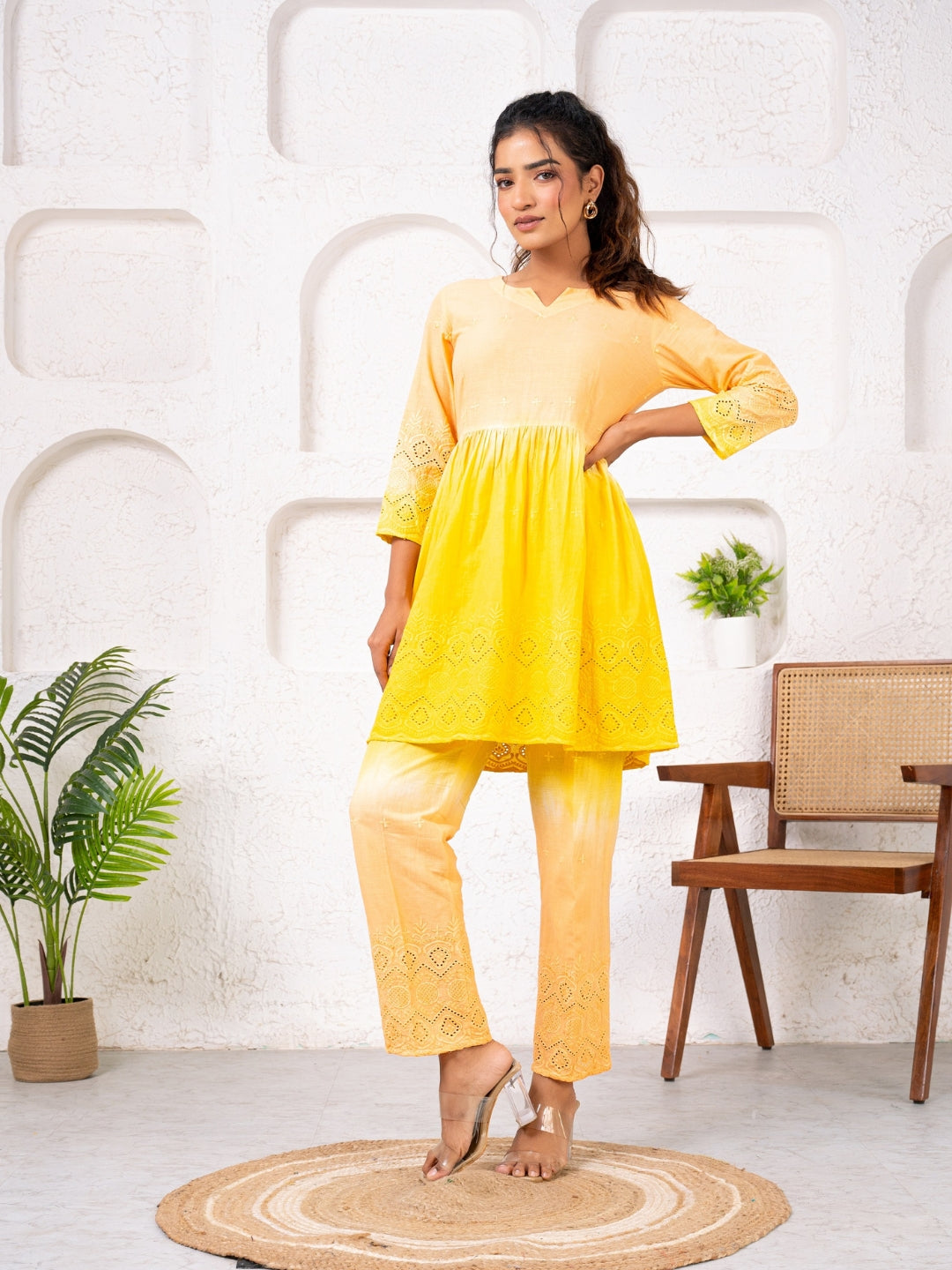 About Product - The Cotton Shiffli Ombre Yellow Co-Ord Set will effortlessly complement a wide range of your casual outings. Available in XS to XL sizes. The perfect outfit you can ever find on the Internet.