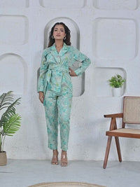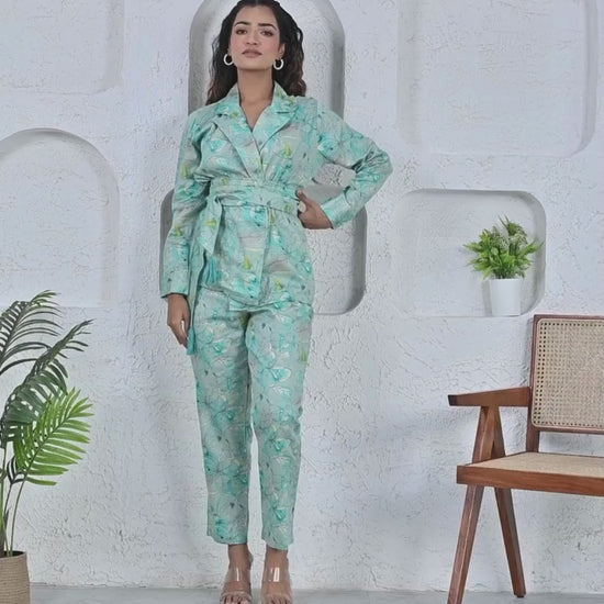 Jam Cotton Printed Blue Blazer Belt Co-ord Set