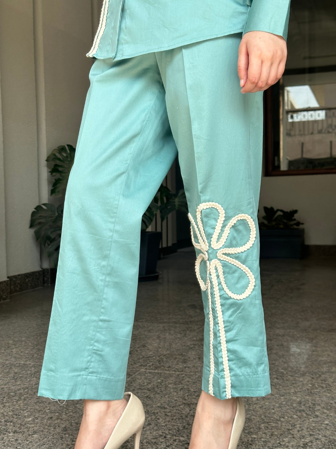 Sea Green Italian Cotton Co-ord Set With Lace detaling